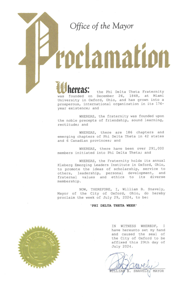 Oxford, OH, July 23, 2024 – The City of Oxford proudly announces the official proclamation of the week of July 29, 2024, as “Phi Delta Theta Week” as the city prepares to host over 1,000 Phi Delta Theta members. This recognition, declared by Mayor William B. Snavely, honors the Fraternity’s significant contributions to the community and its historic importance.