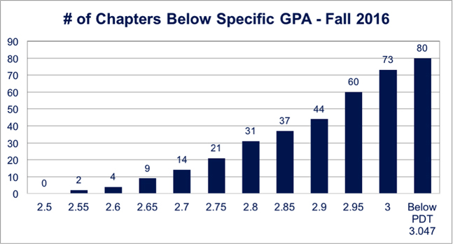 Further, data shows that 66 (36%) of Phi Delta Theta chapters were below the All-Men’s-Average this past Fall 2016, while 44 (25%) of chapters performed in the Top 1/3 of fraternities on campus. Using the new minimum standard with Fall 2016 data, 21 (12%) of Phi Delta Theta’s chapters would fail to meet the minimum.