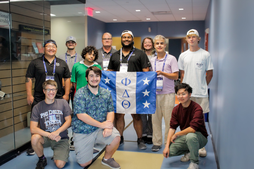 Kris Dudziak with the Alpha Eta Chapter of Phi Delta Theta during the 2025 Kleberg Emerging Leaders Institute. Peer mentor Brysen Morgan pictured holding the flag, Kris is behind him on the left.