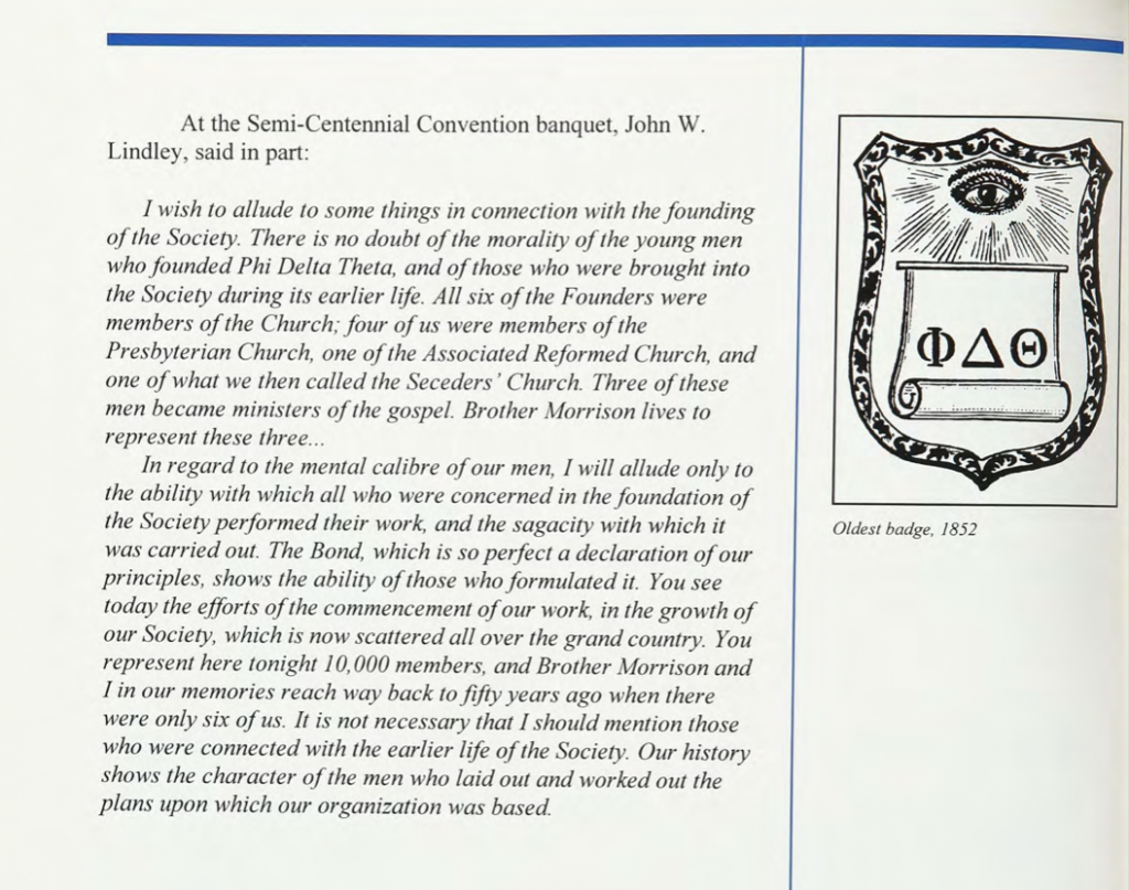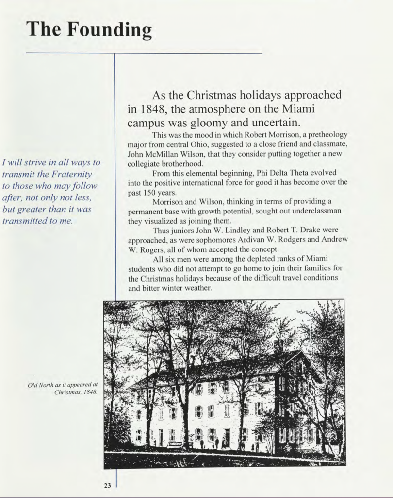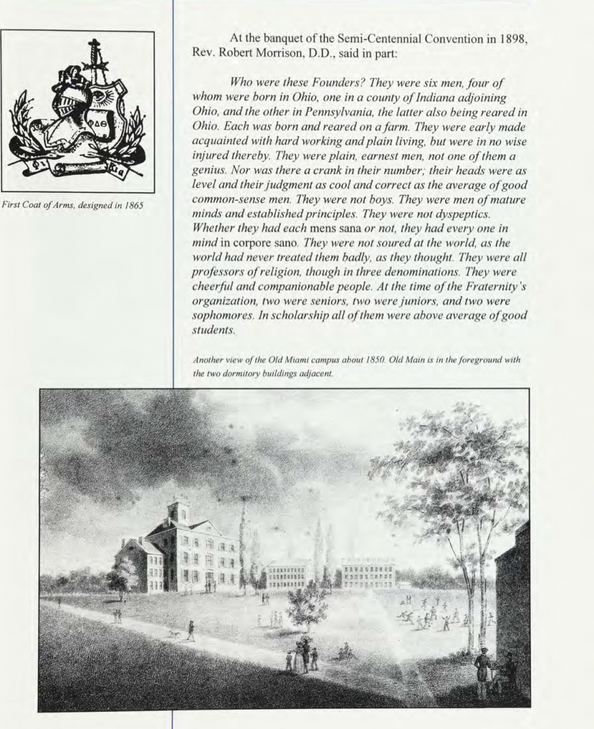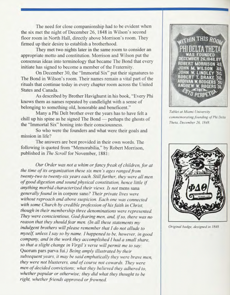 For a more detailed description of the earliest days of the Fraternity’s Founding, see Brother Ritter Collett’s chapter on The Founding in the sesquicentennial anniversary history of Phi Delta Theta, In the Bond.