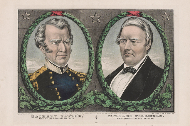 The 1848 presidential election was a presidential election of firsts. It was the first election held in the United States where every state voted on the same day, it was the first held on a Tuesday, and it was the first in which the two candidates that received electoral votes carried the same number of states. On November 7, Mexican-American War General Zachary Taylor defeated US Senator Lewis Cass. Taylor’s term officially began on Sunday, March 4, with the swearing-in ceremony the following day, March 5, due to religious concerns. He died the next year in office on July 9, 1850, and Vice President Millard Fillmore became the thirteenth president.