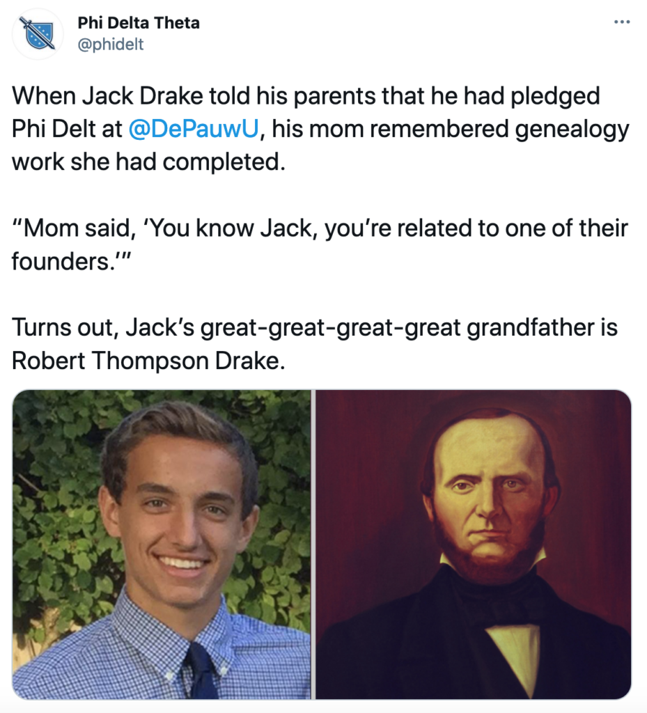 Robert Thompson Drake’s great-great-great-great grandson is an undergraduate member of Phi Delta Theta at DePauw University (Indiana Zeta)!